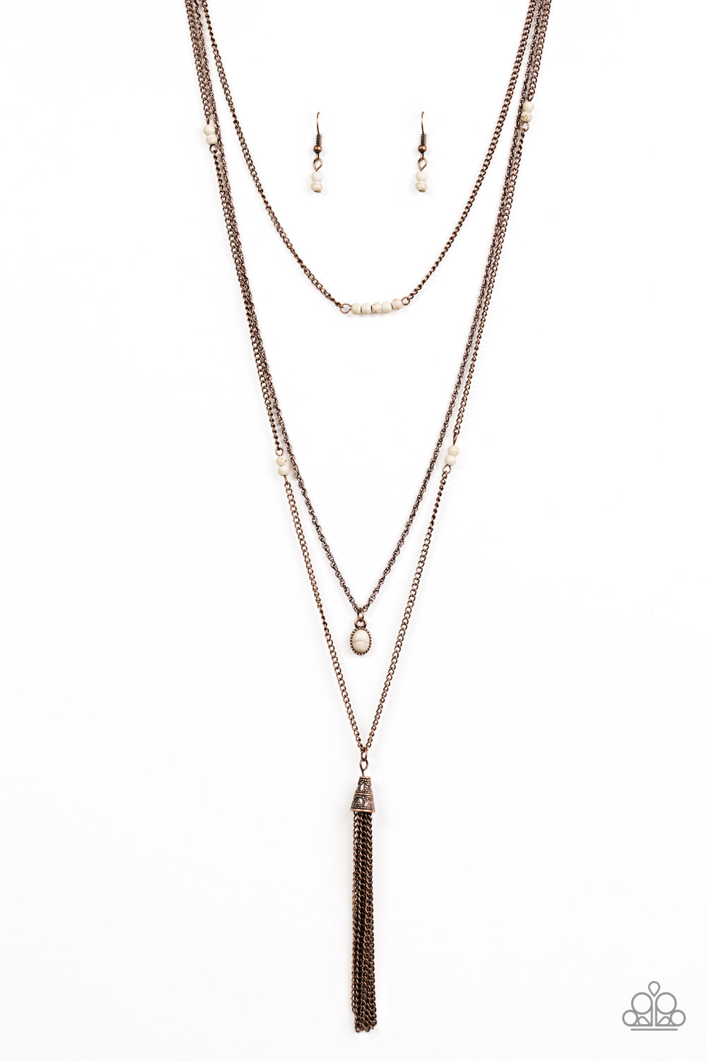 Threaded along a dainty rod, a row of refreshing white stones are suspended horizontally above a dainty white stone pendant. A shimmery copper tassel swings from the lowermost chain, adding a whimsical finish to the seasonal palette. Features an adjustable clasp closure.