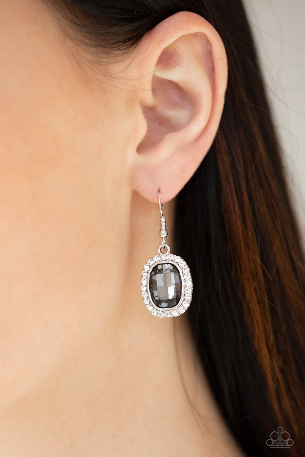 A smoky gem is pressed into a shimmery silver frame radiating with glassy white rhinestones for a timeless fashion. Earring attaches to a standard fishhook fitting.