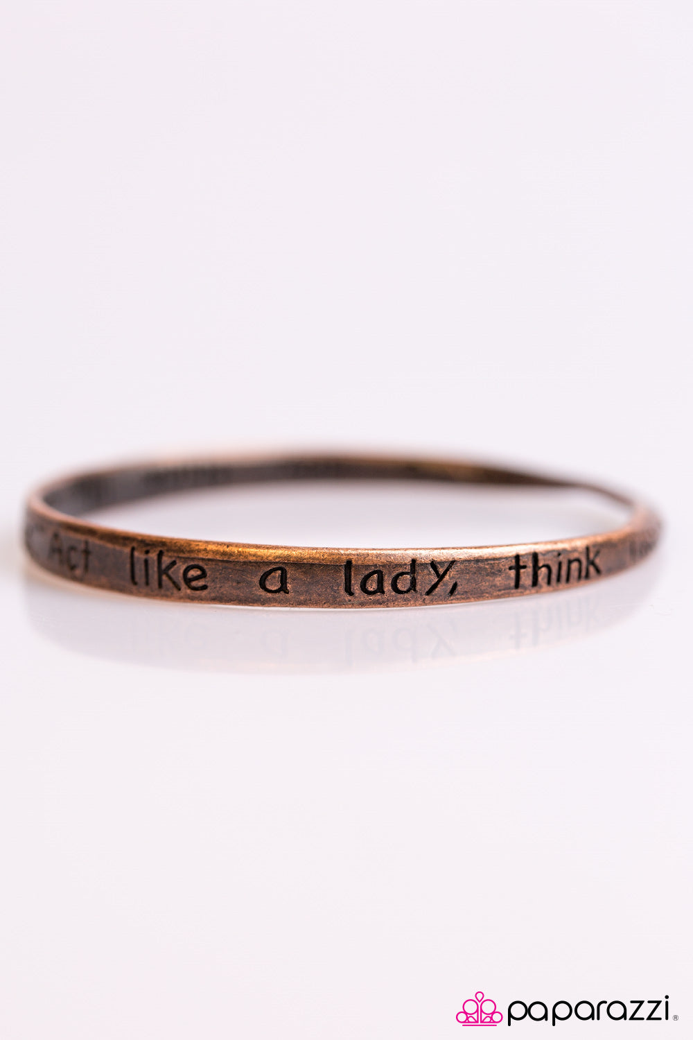 Featuring a subtle twisted edge, a copper bangle is engraved in the phrase “Act like a lady, think like a boss” for a motivational finish.