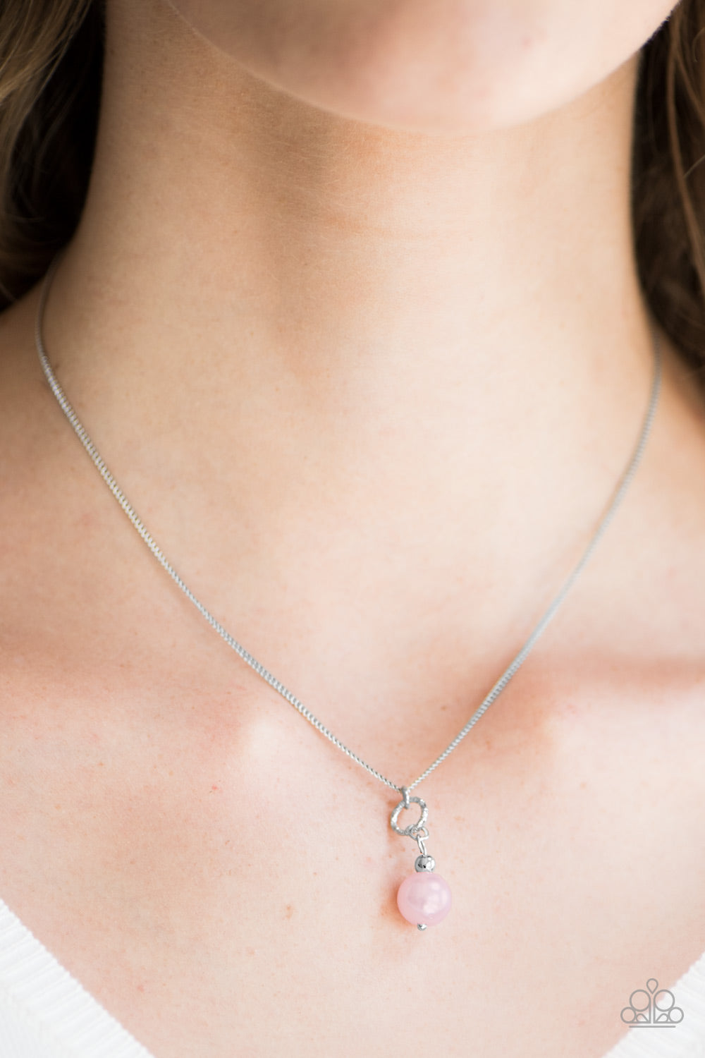 A solitaire pink pearl swings from the bottom of a shimmery silver chain, creating a timeless pendant below the collar. Features an adjustable clasp closure.