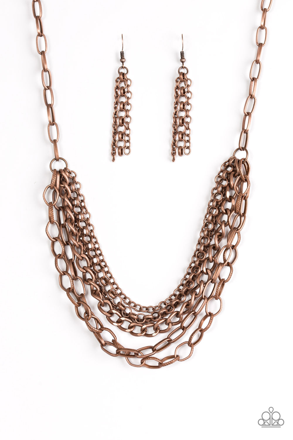 Varying in size and shape, glistening copper chains layer below the collar. Featuring smooth and textured links, the mixed metallic palette stacks into a collision of industrial shimmer for an edgy look. Features an adjustable clasp closure.
