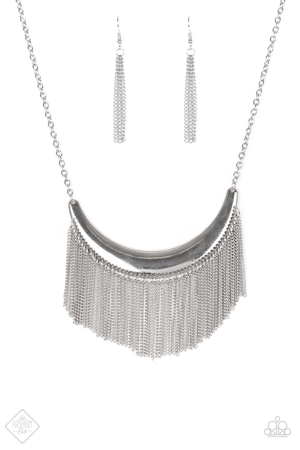 Brushed in an antiqued finish, glistening silver chains stream from the bottom of a silver crescent, creating a bold fringe below the collar for a fierce look. Features an adjustable clasp closure.